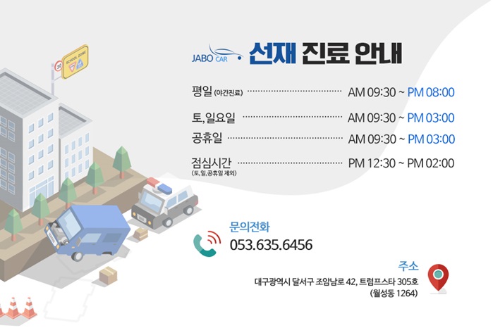 대구 월성동한의원은 평일 밤8시까지 야간진료를 하고, 토요일과 일요일, 공휴일에도 문여는 곳입니다. 교통사고 후유증 치료를 위해 늦은 시간이나 휴일에 방문하시어 검사/치료를 받으시고 건강을 회복하시길 바랍니다.