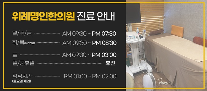 성남 위례한의원은 화요일, 목요일 야간진료를 하고 있으며, 토요일에도 문여는 곳입니다. 교통사고 치료 잘하는 곳에서 후유증상의 원인부터 꼼꼼히 확인하시고 건강을 회복하시길 바랍니다.