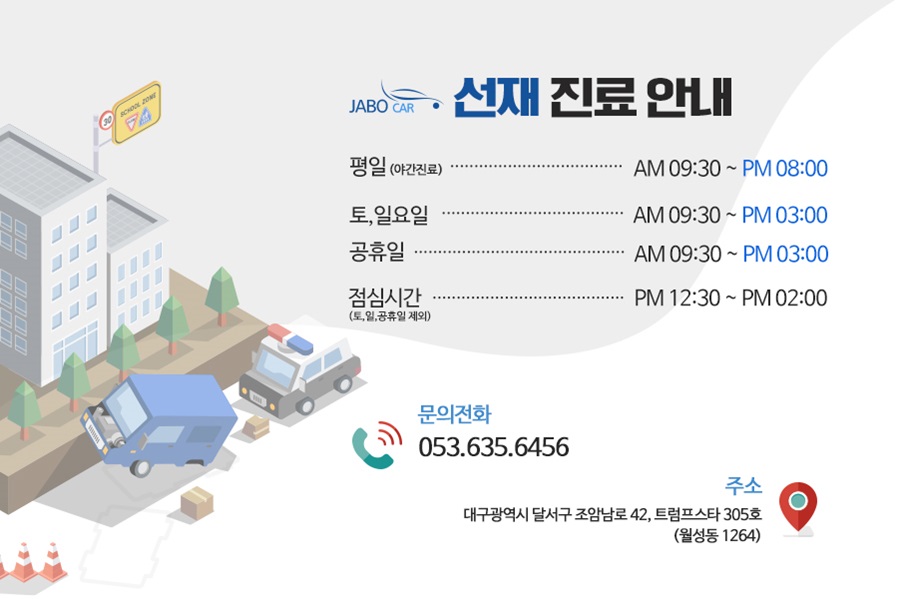 대구 월성동한의원은 교통사고치료를 평일 밤 8시까지 받을 수 있는 야간진료하는 곳입니다. 아울러 토요일과 일요일, 공휴일까지 문여는 곳이기 때문에 휴일에 방문하시어 후유증을 치료받는데 도움을 받으실 수 있습니다.