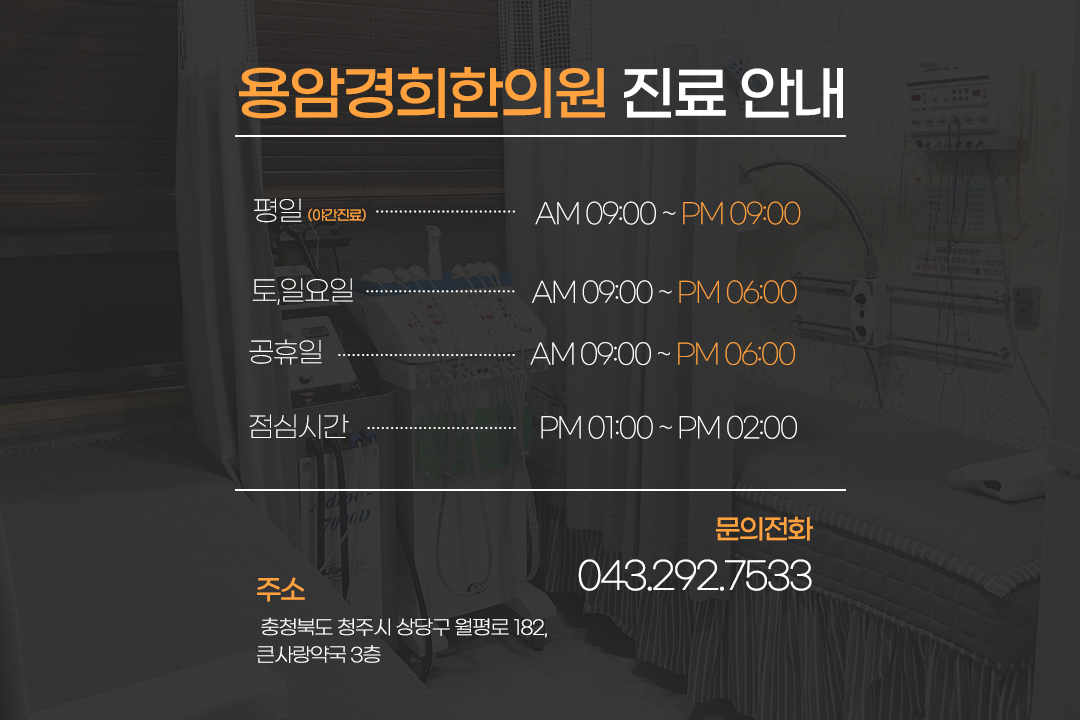 평일 야간진료는 물론 토요일, 일요일, 공휴일도 문여는곳인 금천동한의원 용암경희한의원은 많은지식과 경험을 바탕으로 증상의 시작부터 꼼꼼하게 개인맞춤으로 진행되며 한방다이어트, 각종 보약치료 등 다양한 진료도 받아보실 수 있습니다.