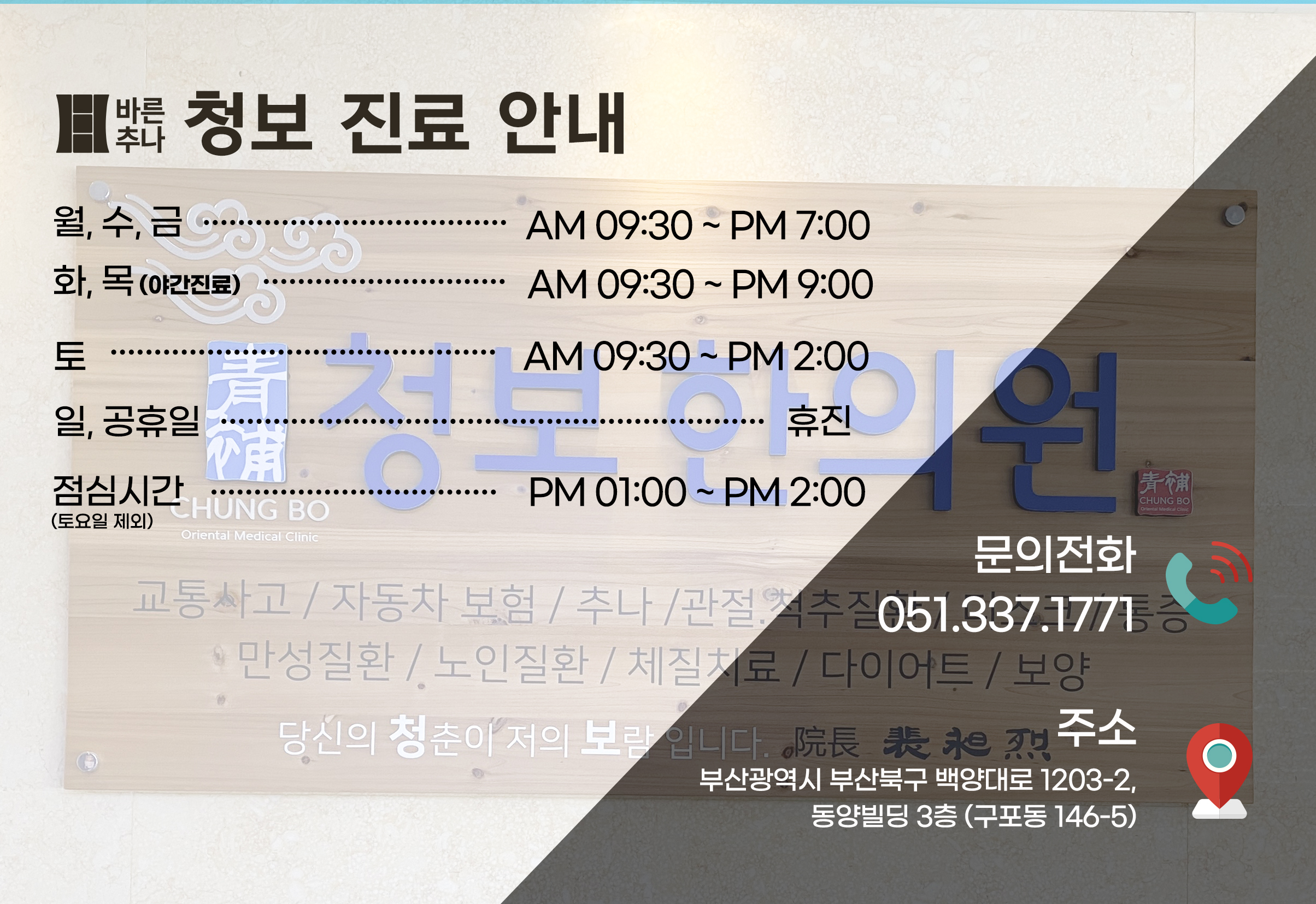 그 밖에 추나와 함께 한약처방, 부항, 봉/약침, 물리치료 등의 다양한 한방요법을 병행하며 빠른 회복을 도와드리는데요. 화/목 야간진료하며 토요일도 문여는 곳인 화명동추나치료 청보는 불편감의 원인을 꼼꼼하게 진단하여 개인맞춤으로 진료를 도와드리고 있습니다.