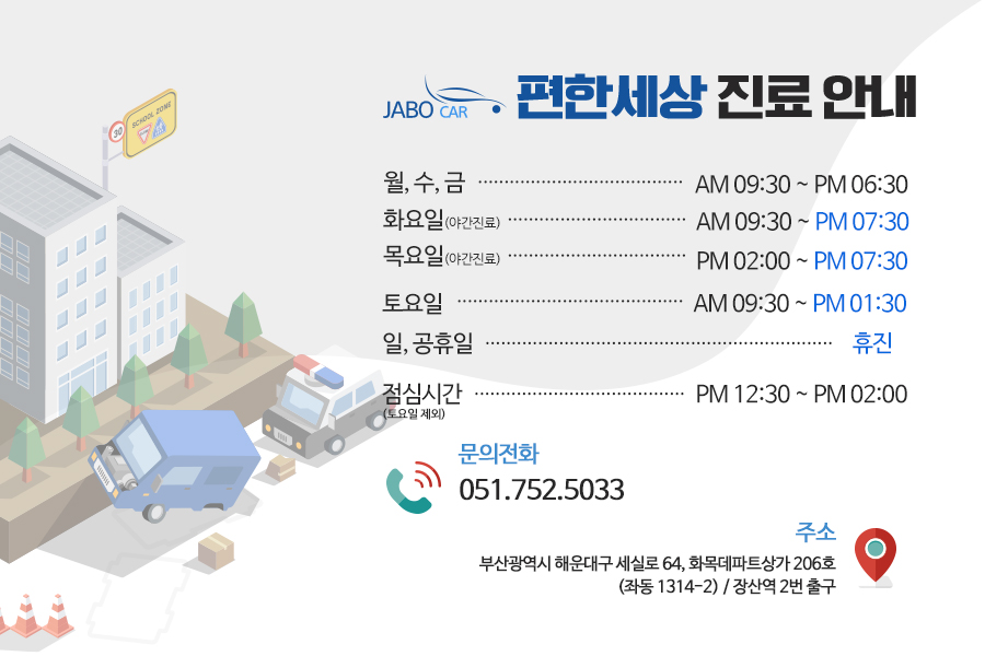 편한세상한의원 해운대점은 화, 목 저녁 7시 30분까지 야간진료를 진행하며 토요일에도 운영을 하고 있습니다. 여러 가지 만성 통증 질환으로 고생하시고 계신 많은 분들이 통증에서 해방되어 환하게 웃는 모습으로 한의원 문을 나서는 그날을 생각하며, 하루하루 최선의 진료를 다하겠습니다. 감사합니다.