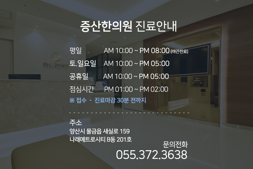 양산교통사고병원에서는 위 같은 한방치료들을 자동차보험을 적용해 본인 부담금 없이 치료 받으실 수 있습니다. 또한 평일 오전 10시부터 오후 8시까지 진료중에 있으며, 휴진 없이 투요일, 일요일, 공휴일 모두 오후 5시까지 언제든 진료 해 드리고 있습니다. 풍부한 교통사고치료 임상경험과 지식을 바탕으로 환자의 건강상태를 꼼꼼히 진찰해 재발 없이 잃어버린 건강 되찾으실 수 있도록 도와 드리겠습니다.