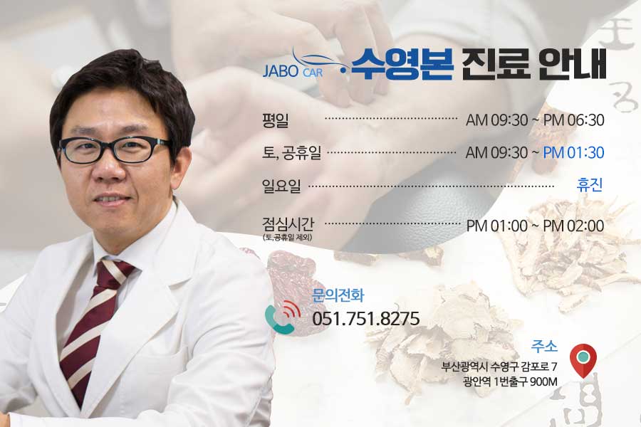 교통사고후유증, 산재, 수술 후 재활 등은 특화 진료가 필요하다. 경증이라도 만성질환으로 번질 수 있으니 자세한 검사를 받고 집중 관리를 해야 할 것이다. 광안리한의원 수영본한의원은 평일 9시부터 저녁 6시까지 운영하며 토요일 낮 1시까지 진료를 보고 있다.