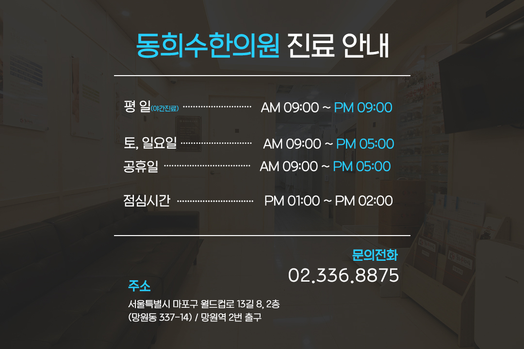 교통사고휴유증상을 전문으로 치료하는 합정역한의원 ‘동희수한의원’은 교통사고후유증 외 추나요법, 바른체형교정, 어혈관리 등 환자의 질병과 상태에 따른 맞춤형 치료를 진행을 하고 있습니다.
