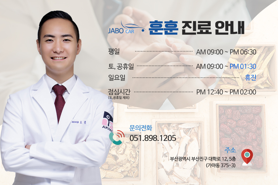 범천동한의원 훈훈한의원에서는 교통사고 치료 뿐만 아니라 환자의 상태에 따른 알맞은 치료들을 진행하고 있다. 구안와사, 소아성장, 한방부안과, 비염, 한방내과, 근골격계 및 통증클리닉 등의 특수 증상에 따른 솔루션을 제안하고 있다. 토요일, 공휴일(일요일 제외) 운영하는 한의원으로 언제든 편하게 방문할 수 있다는 장점도 있다.